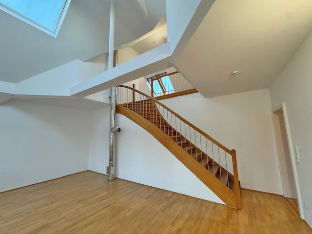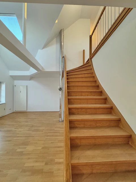 Über eine interne Treppe erreicht man die 5. Etage, die durch große Dachflächenfenster belichtet ist. Hier befinden sich ein offenes, geräumiges Galeriezimmer (Ideal für Home Office), 2 Schlafzimmer und ein kleines Zimmer mit ca. 5,5 m2.